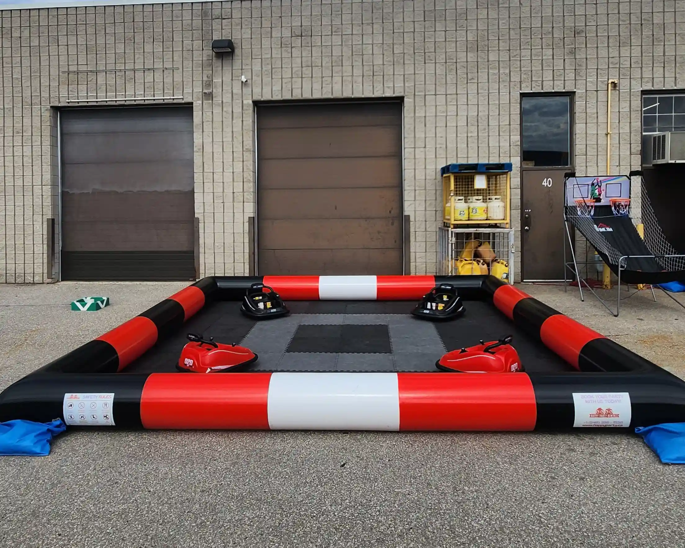 Includes a 2 vs 2 bumper cars set with arena, a bouncy castle, and a food machine of your choice