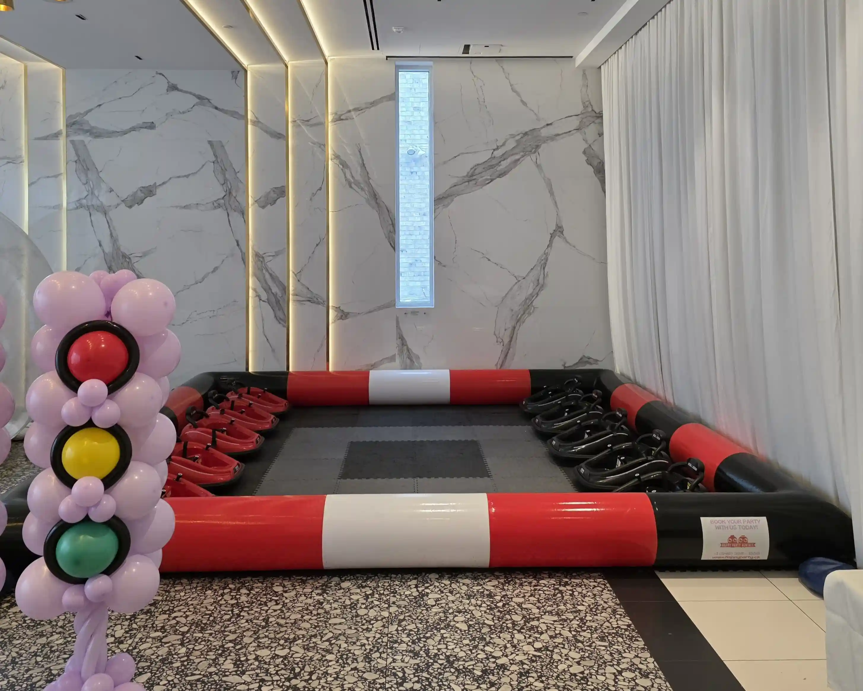 Includes a 5 vs 5 bumper cars set with arena, any bouncy castle, any food machine, and any game of your choice